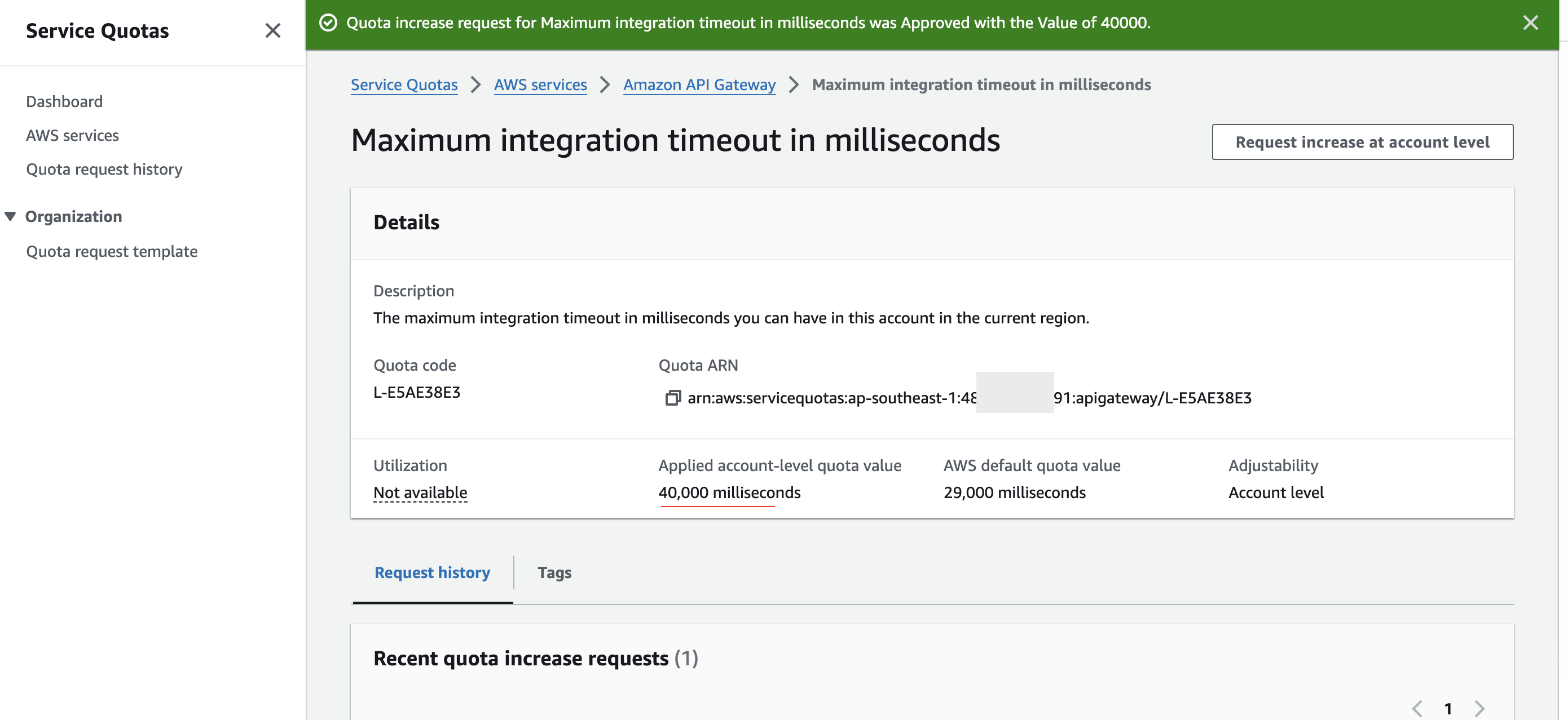 - Bước 1: Tăng "maximum integration timeout in miliseconds" trong Service Quotas ở Management Console. Ví dụ, chúng ta tăng lên 40,000 mili giây. Việc request này sẽ được approved nhanh chóng: