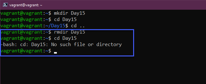 Với cd, chúng ta có thể thay đổi thư mục. Để di chuyển vào thư mục mới tạo của mình, chúng ta có thể thực hiện việc này với lệnh cd Day15 cũng có thể sử dụng tab để tự động hoàn thành câu lệnh với thư mục có sẵn. Chúng ta có thể quay lại vị trí lúc mới bắt đầu bằng câu lệnh cd. .