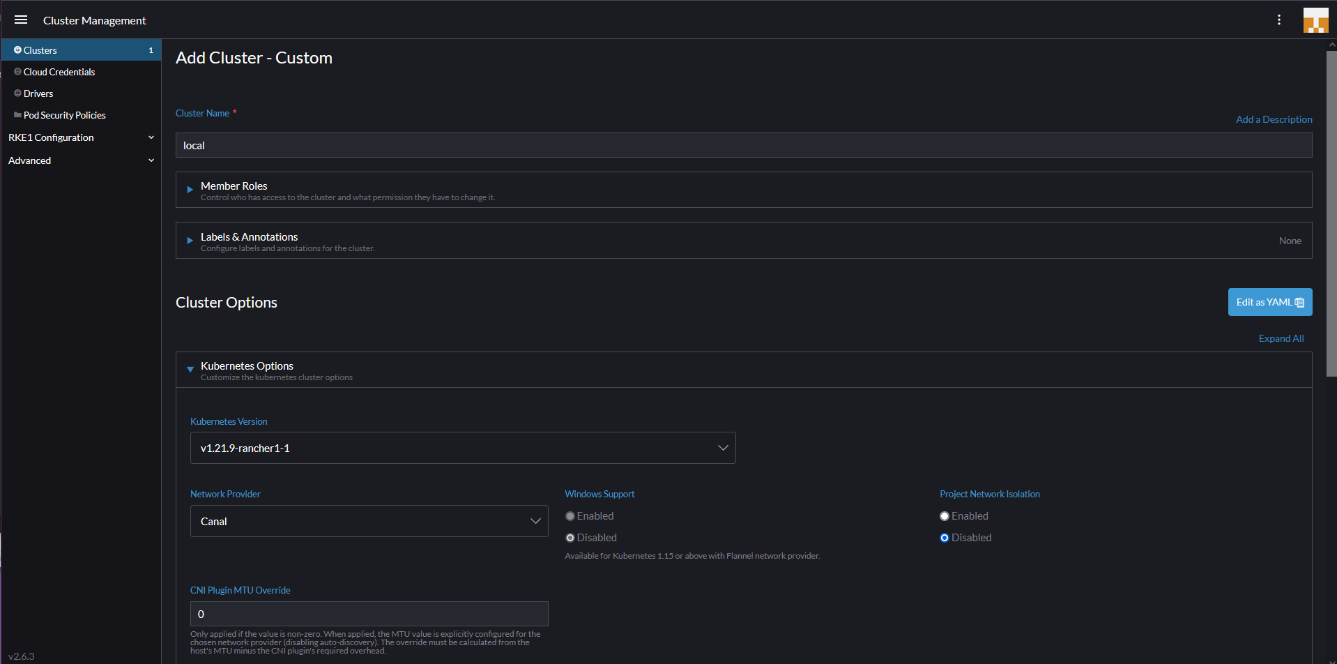 Chúng ta sẽ chọn "custom" vì chúng ta không sử dụng một trong các nền tảng được tích hợp. Trang mở đầu là nơi bạn xác định tên cluster của mình (có ghi local ở dưới nhưng bạn không thể sử dụng local, cluster của chúng ta là vagrant). Bạn có thể xác định các phiên bản Kubernetes tại đây, nhà cung cấp mạng và một số tuỳ chọn cấu hình khác để khởi động và chạy cụm Kubernetes của bạn.
