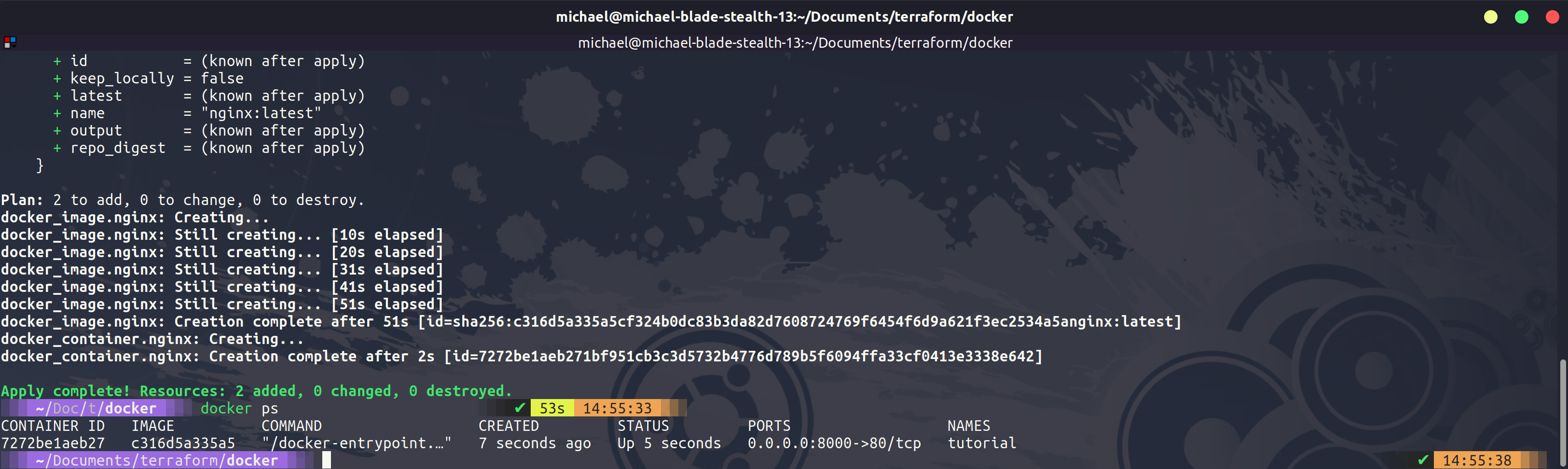 Sau đó, chúng ta chạy lệnh terraform apply và kiểm tra đầu ra của lệnh docker ps, chúng ta sẽ thấy các container mới được tạo ra.