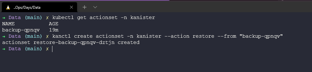 Chúng ta bây giờ có thể sử dụng Kanister để lấy lại dữ liệu quan trọng của chúng ta bằng cách sử dụng kubectl get actionset -n kanister để tìm tên ActionSet mà chúng ta đã lấy trước đó. Sau đó, chúng ta sẽ tạo một ActionSet khôi phục để khôi phục dữ liệu của mình bằng cách sử dụng kanctl create actionset -n kanister --action restore --from "backup-qpnqv"